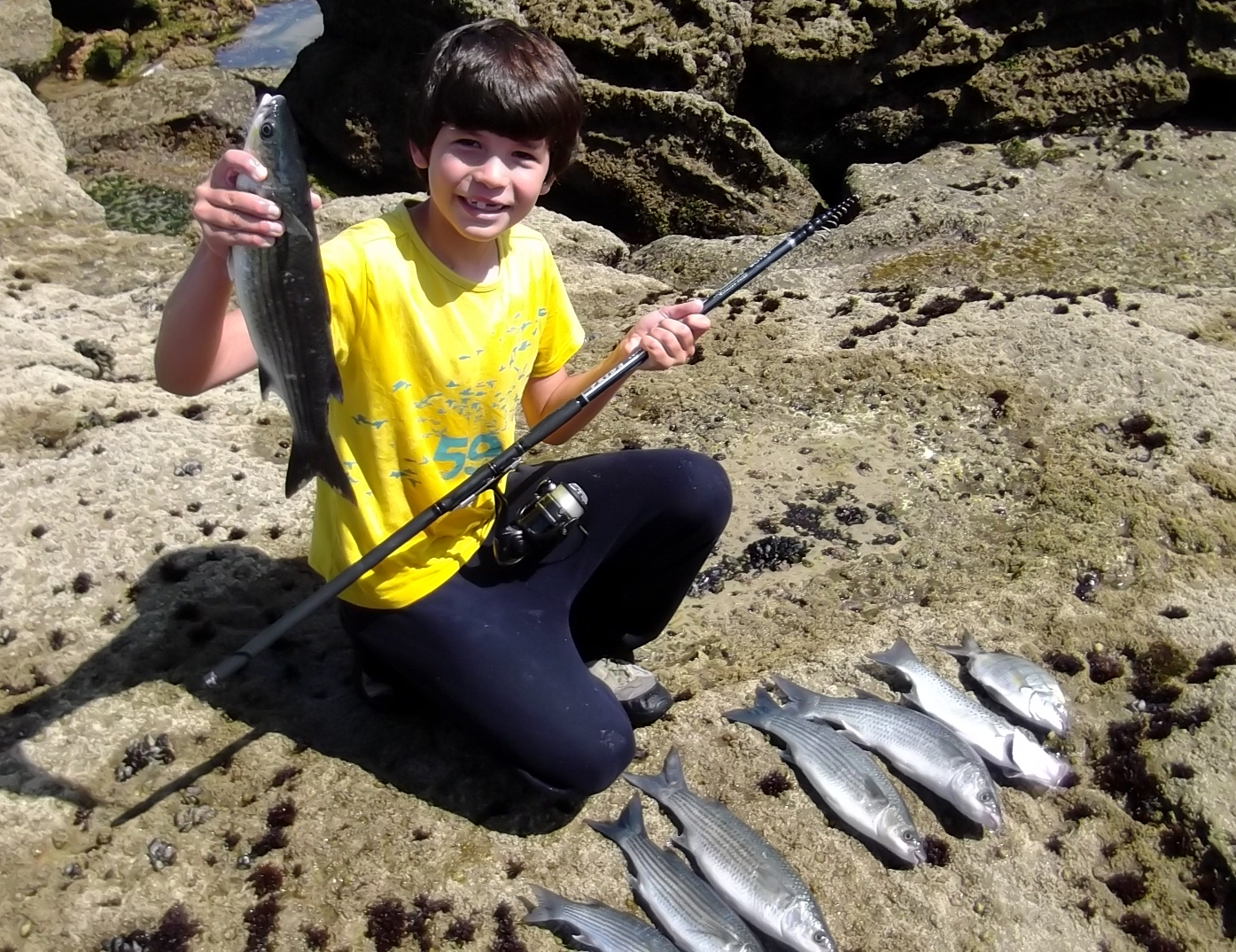 Depois de preparar um balde de engodo, fui salpicando as pedras e lajes de dentro para fora, coloco a caixa de filetes de sardinha à cintura e lá vou eu até onde o mar deixava, uma vez que já enchia não consegui estar lá dentro muito tempo, mas nos 10 minutos que lá tive, tirei 3 sargos e uma tainha, depois fui obrigado a vir cá para fora, e mesmo com pouca agua o peixe estava lá e fui tirando uns atrás dos outros, entre os muitos sargos ainda deu uma baila, um robalote e 9 tainhas.