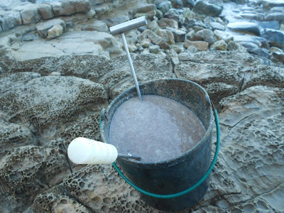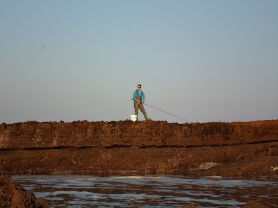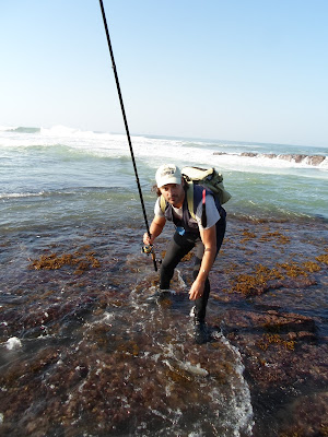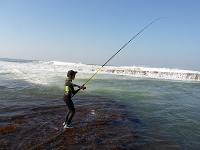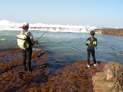Preparamos o material, o mar tinha um toque valente, volta não volta, vinha um enchio daqueles bem fortes, mas como a pescaria ia ser feita toda praticamente de maré vazia, dava para pescar razoavelmente nalguns buracos.