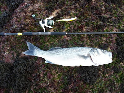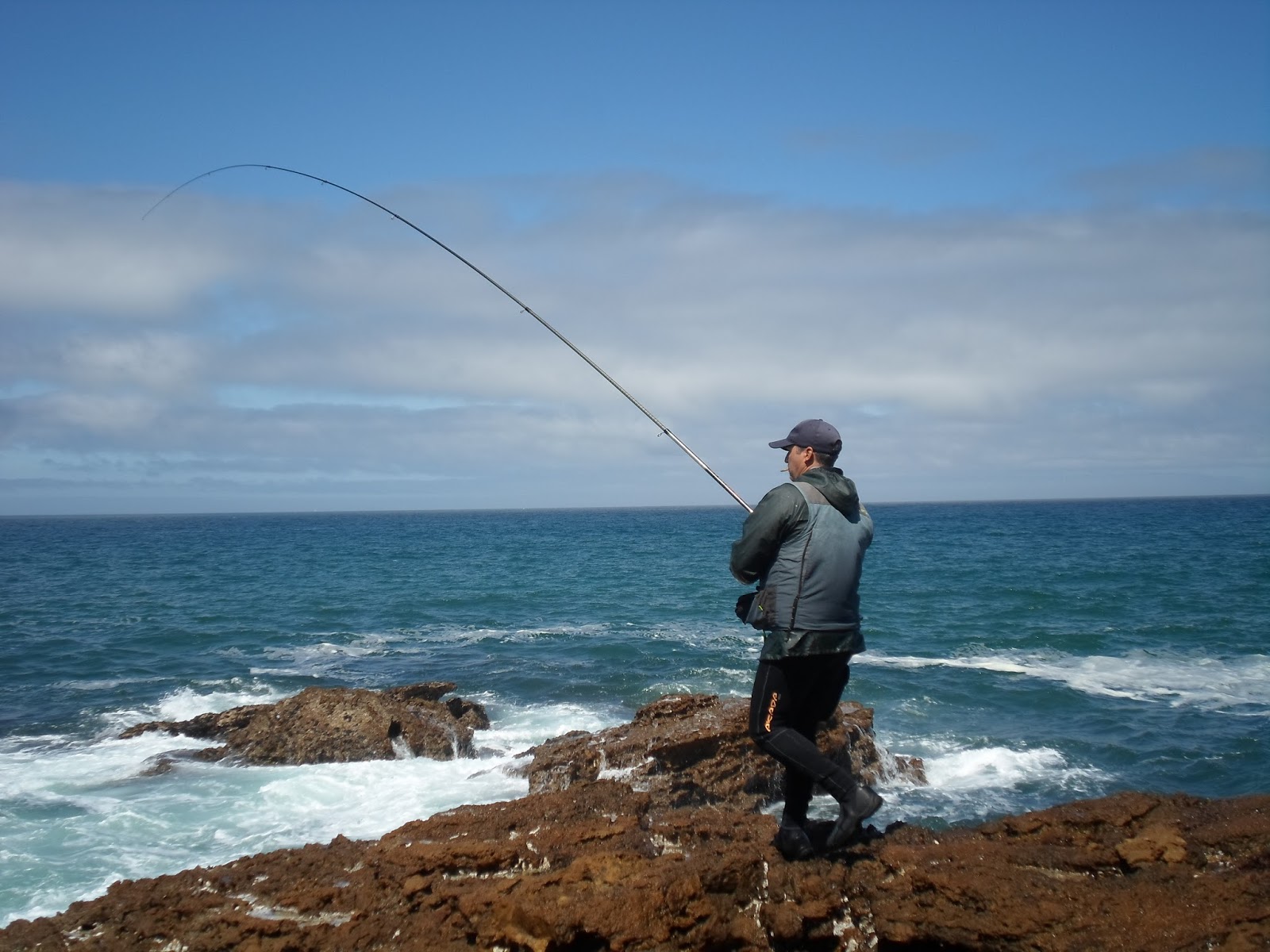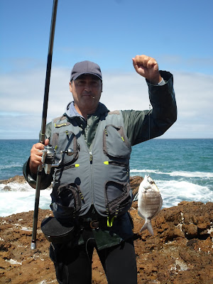 Com o mar a passar já por cima da laje do Cavalinho, não consegui ir ao buraco pretendido, fiquei um pouco mais recuado, engodei e logo comecei a ver tainhas à tona da agua, apesar de não ser a minha pesca, nem ter muita paciência quando eles estão manhosas, tentei fazer-me a elas.